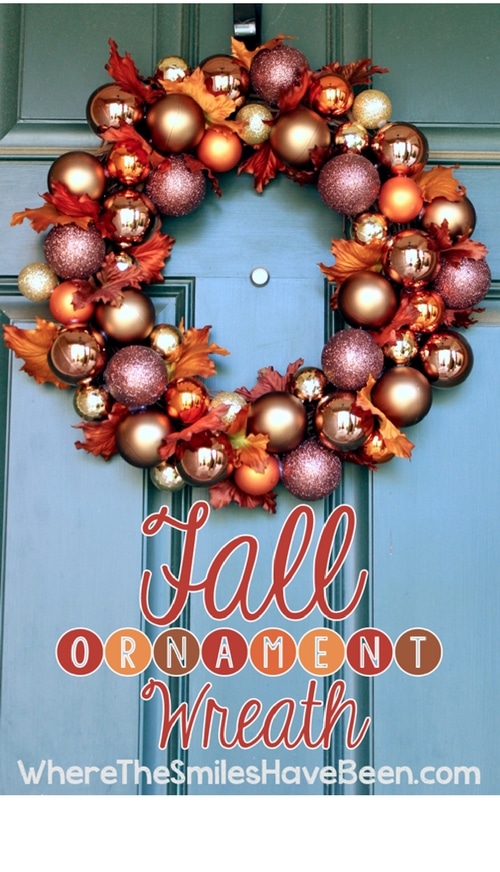Materials: Grapevine wreath form, ornaments, fake fall leaves, hot glue gun and several hot glue sticks, and floral wire.
