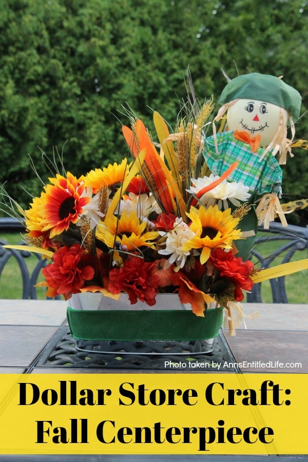 Materials: Dollar store flowers, tin, floral foam, small scarecrow, wire edged ribbon, floral picks, wire cutters, glue gun, hot glue sticks, and floral tape.