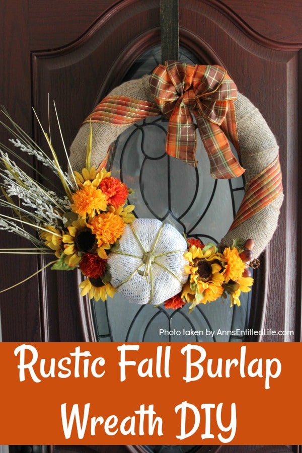 Materials: 18″ wrapped burlap wreath, wire edged ribbon, bow, pumpkin, assorted fall flowers, floral picks, wire cutters, glue gun, hot glue sticks, and floral tape
